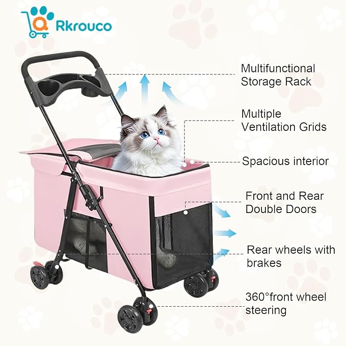 - TRENDY DESIGN: Portable pet stroller for cats and puppies adopts extended body design to make the interior space more spacious, great suit for small and medium-sized pets, carry two kittens out at the same time, so that you can enjoy double happiness, also equipped with multifunctional trays and storage pockets for water bottles and small items, free your hands
