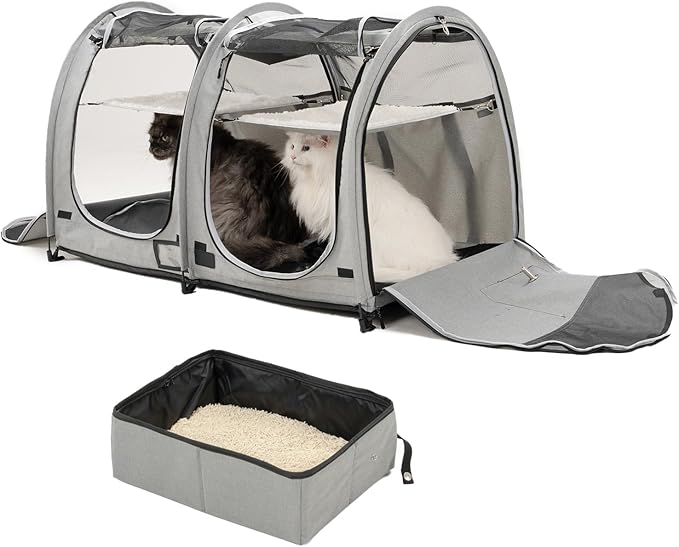 - NICE COMFORT - The oversized two-compartment structure provides a spacious and comfortable space for your kitten. Inside the cage, the structure is divided into two symmetrical parts, including a zippered Oxford cloth door separating the two sides. Above each part is a detachable fine and comfortable flannelette hammock, and below is the same flannelette mat. Your cat can rest and play in this happy nest, and we also have a foldable litter box and water bottle which is as complete as an apartment.