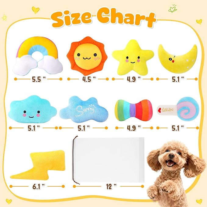 - Unbox Joy for Your Pup:This set includes 9 adorable squeak toys in various shapes and colors. Specially designed for puppies and small dogs to chew, fetch, and cuddle.The set also comes with a convenient storage bag for easy storage and on-the-go play