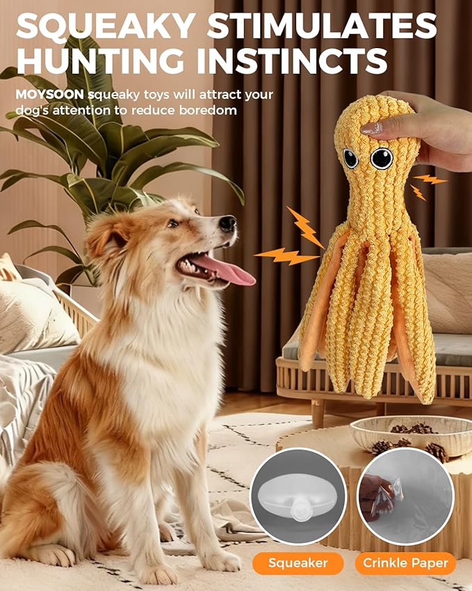 - SQUEAKY & CRINKLE FUN: Built with an internal squeaker and crinkly paper, this octopus toy excites dogs. The multiple tentacles invite grabbing and shaking, making it an engaging interactive dog toy for boredom and a safe dog toy to keep them busy, while the textured corduroy aids dental health