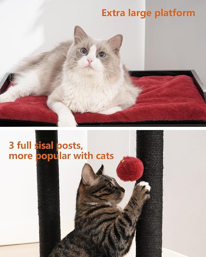 FourFurPets 26.7in Large Cat Tree Tower Condo, Cat Scratch Posts for Indoor Cats, Big Plate, Three 23.6in Full Sisal Scratching Posts, Black&Red