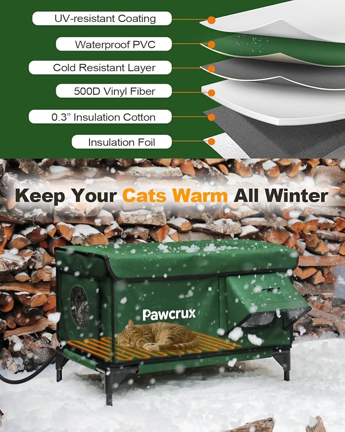 - ๐ช๐ฎ๐ฟ๐บ, ๐๐ป๐๐๐น๐ฎ๐๐ฒ๐ฑ, ๐ฎ๐ป๐ฑ ๐๐ผ๐๐: Our heated outdoor cat house ensures your kitty stays comfortably warm even in freezing temperatures. This outdoor heated cat house features aluminum foil insulation to keep your cat snug and cozy throughout the cold winter months.
