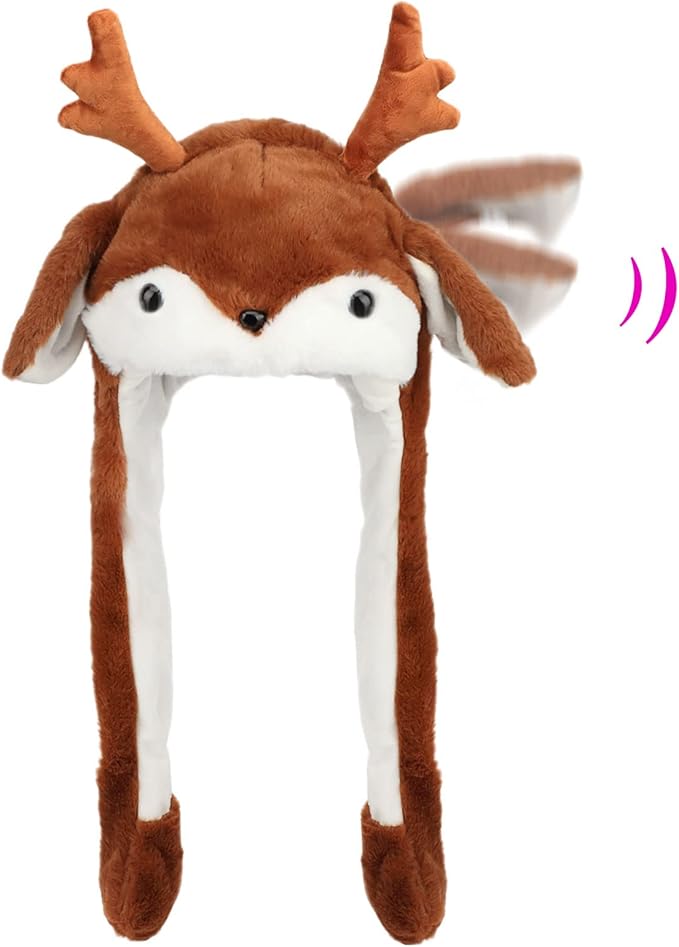- BE A HAPPY ELK IN STYLE: With this stunning reindeer hat, which is made of velvety-soft plush material. The Animal ear is movable, it can flap its ears! Press the paws, the ears on the same side will move up and down, very funny. Perfect for wearing it to take photos and videos with matching the music you love.