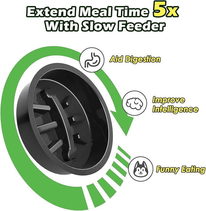 - Slow Food Concept: The slow food concept is widely respected by experts. Slow food bowls can help you achieve this goal. When your dog eats, the raised portion of the bowl separates the food and your dog will search for the food in the bowl, thus slowing down the rate at which he eats and helping your dog develop better eating habits