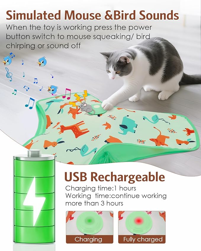 - 【Lifelike Mouse Squeaky Cat Stimulation Toys】Once game begins, this interactive cat toy emits realistic mouse squeaks and bird chirps to attract your cat's attention and sharpen their hearing. Hidden feathers and an irregularly moving cloth cover appear and disappear, stimulating your cat’s natural chasing instincts and helping alleviate boredom and loneliness