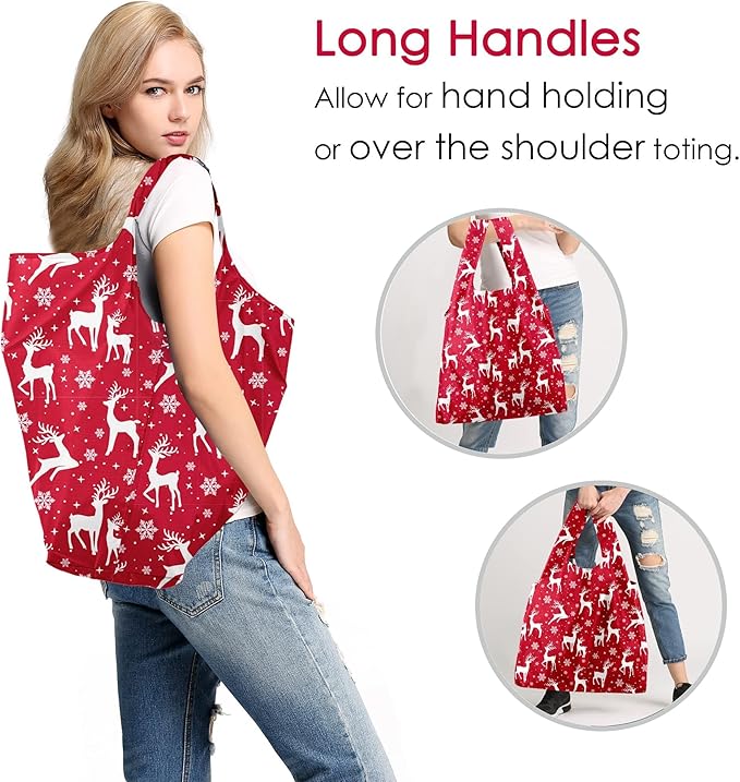 BeeGreen Christmas Reusable Grocery Bags with Zipper Storage Pouch 10 Packs Deer Reusable Shopping Bags Bulk with Elastic Band Foldable-Machine Washable Christmas Gifts Tote Bags
