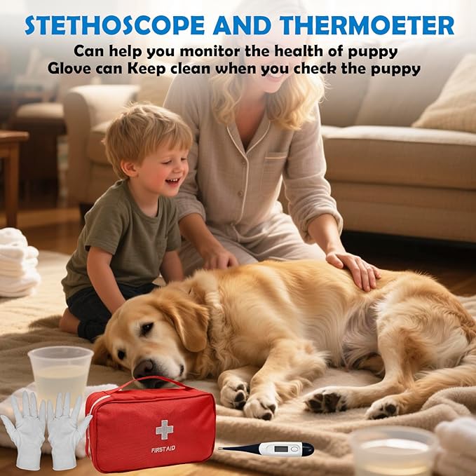 - Whelping Kit for Puppies Birth,Professional escort Reduce risks during childbirth:puppy supplies(sterile scissors/umbilical cord clip)disinfected with alcohol to avoid infection; Emergency rescue: amniotic fluid suction device solve the suffocation crisis of newborn puppies No more panic when labor starts!