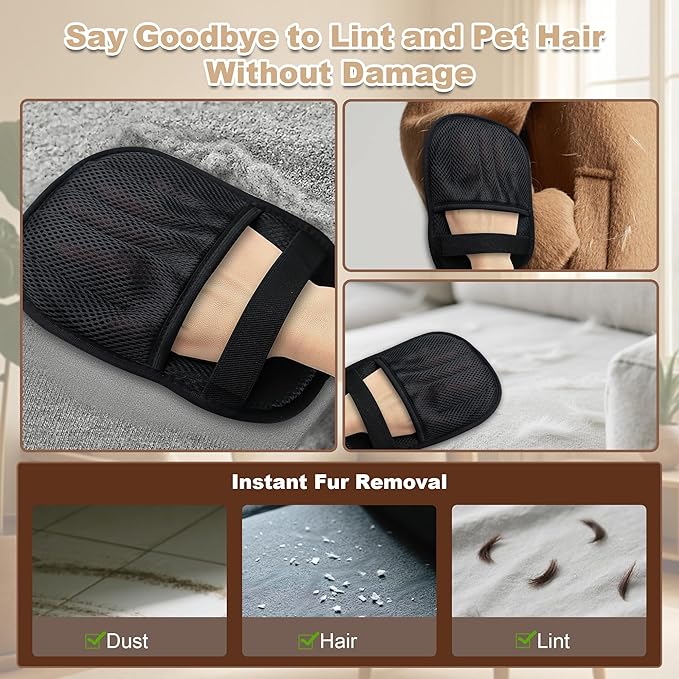 - 【2-in-1 Grooming & Multi-Surface Versatility】 One glove, multiple uses! Gently massage and de-shed loose fur during bath time, then use the same glove to clean sofas, carpets, bedding, clothes, or car seats. Perfect for handling both pet grooming and household cleaning with ease.