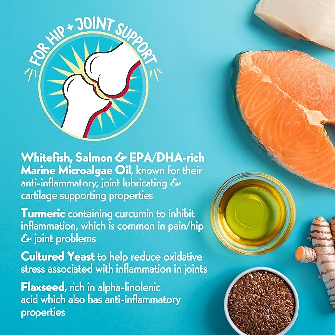 - Supports Hip and Joint Health: Formulated with turmeric to reduce stress associated with joint inflammation plus marine algal oil, whitefish, and salmon for anti-inflammatory and lubrication benefits to support joint mobility and hip health.