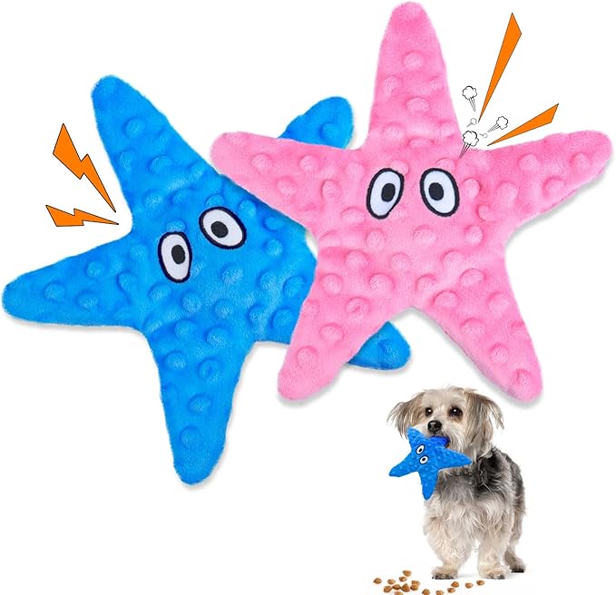 - [Squeaky & Crinkle Dog Toys] The built-in squeaker will attract their attention by making beautiful sounds when pawing or biting the small dog toys for small breeds. Large crinkle paper in five hard-to-resist starfish arms stimulate sensory and excite them to interact with you. Great dog toys to keep them busy for hours and reduce boredom