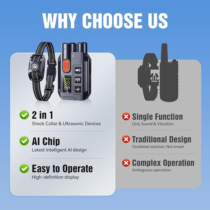 - [Up to 3300 ft Control Range – Perfect for Outdoor Adventures] Enjoy full control even in vast outdoor spaces, with a remote range of up to 3300 feet. Whether you're hiking, playing fetch in the park, or letting your dog run free at the beach, this collar ensures you can manage your dog from a distance. Note: The ultrasonic mode works best up to 16 feet—ideal for indoor training or short-range correction in the backyard. It also supports dual-dog control, so you can train two dogs at once.