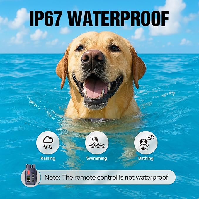 - [IP67 Waterproof – Built for Any Weather Condition] This Dog Shock Collar is IP67 waterproof, making it perfect for all-weather training. Whether your dog loves to splash in puddles, swim in the lake, or you’re training in heavy rain, this collar continues to perform. It’s reliable in extreme conditions like snow, rain, or mud. No need to worry about wet environments—whether it’s hiking, camping, or just playing outdoors, the collar stays effective and ensures continuous training in any weather.