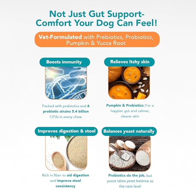 - COMPLETE DIGESTIVE, IMMUNE & SKIN HEALTH SUPPORT FOR DOGS – More than just gut support! This vet-formulated blend with prebiotics (inulin), probiotics, pumpkin, and yucca root not only regulates bowel movements and boosts immunity, but also helps relieve itchy skin and supports yeast balance—two common signs of gut flora imbalance.