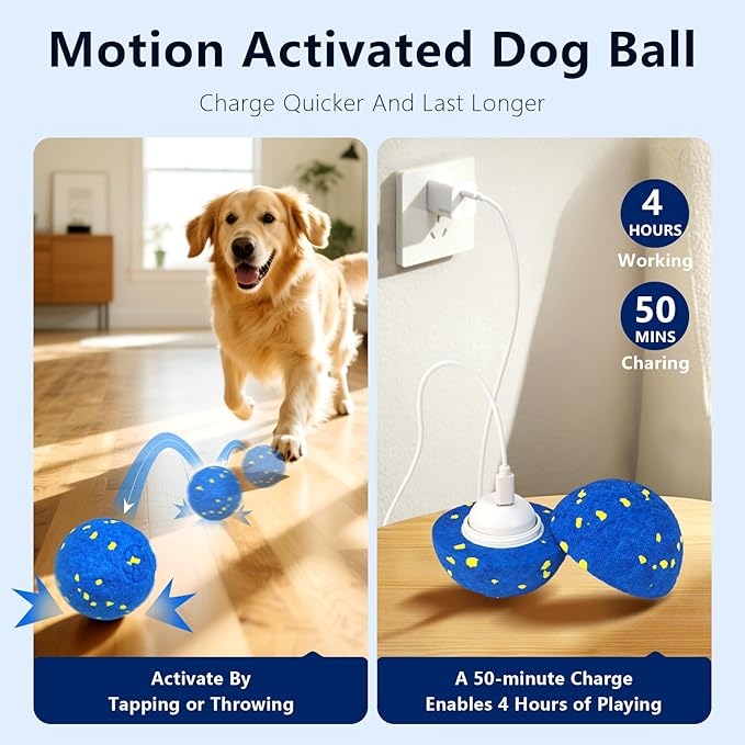 - Long Time Play - This smart rolling dog ball is equipped with a type-c charging cable. A single 50-minute charge provides 4 hours or more of continuous playtime, eliminating the need for frequent charging and ensuring your pet has ample time for playful activity