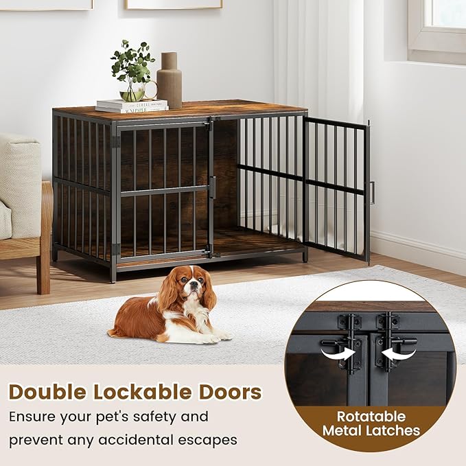 PETSITE 40 Inch Modern Dog Crate Furniture, Heavy Duty Wooden Dog Kennel with Double Lockable Doors, Decorative Dog Cage End Side Table for Small and Medium Sized Dogs (Rustic Brown)