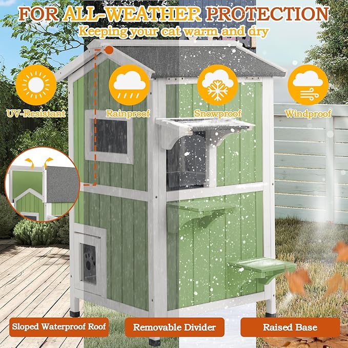 PetsCosset Insulated Cat House Outdoor Weatherproof All-Round Insulation Two Story Outside Wooden Feral Cat Shelter for Winter with 2 Escape Doors, Pull Out Floor and Openable Roof for Cats, Green