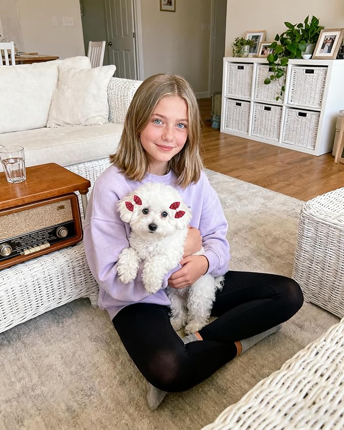 - QTY: 20PCS(10PAIRS). Cute pink, red, purple, orange, yellow, black, white, green and blue dog hair clips as pictures shown. Good for daily walking, birthday, wedding and photograph, it is very sweet to give these dog grooming bows to your furry on holiday. You will love them