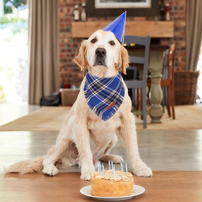 - Blue Dog Bandanas: Two different blue plaid patterns with stylish tasseled edges, Perfect for boy dogs, they give your pup a dapper and trendy look, ideal for daily walks, outdoor adventures, park hangouts, or gatherings.