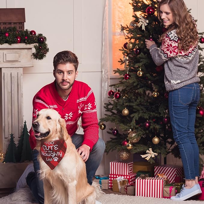 - 【FUNNY DESIGN】Original deisgn "Too cute for the naughty list" printed on classic red and green plaid dog bandana. Make it an interesting Christmas themed décor for your pet dogs.