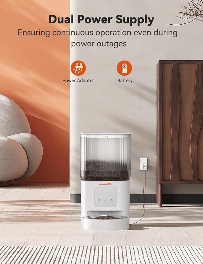 - 【Remote APP Control】 Manage your pet’s meals from anywhere with the “WOpet Life” app (iOS/Android). You can set 1-10 meals per day and up to 8 portions of dry food per meal depending on your pet's needs. Reward your furry friend remotely with on-demand feeding, check detailed feeding history, and share access with family members—perfect for busy households or travel.