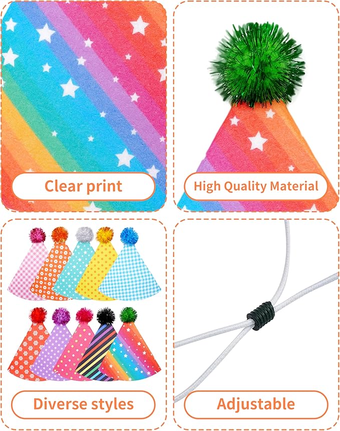 - Color: 10 different styles-- design with colorful patterns include plaid, stripe, star, polka dot and flower. Colors are red, pink, orange, yellow, purple, green, blue, rainbow etc. These party hats for stuffed animals felt have matched colorful tinsel balls on their top. You and your furry friends can have fun time together when wearing them on birthday party