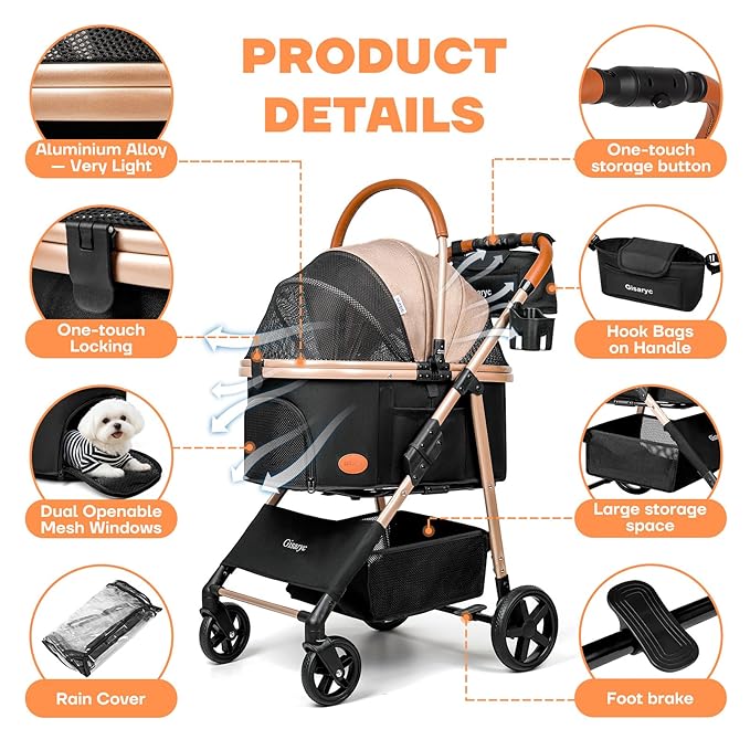 Dog Cat Stroller for Small/Medium Pets up to 50 lbs, 3-in-1 Foldable Pet Stroller with Detachable Carrier, Car Seat, Storage Basket, Cup Holder, Hanging Bag, Rain Cover, All-Terrain 4 Wheels (Khaki)
