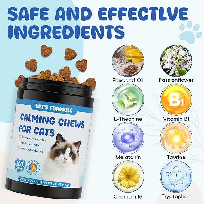 - Veterinarian-Recommended Quality Assurance: We are committed to your pet's safety and well-being. Our cat calming chews are produced under strict quality standards, free from wheat, soy, and artificial additives. It's a formula trusted by veterinarians and loved by cats for long-term calming cat treats.