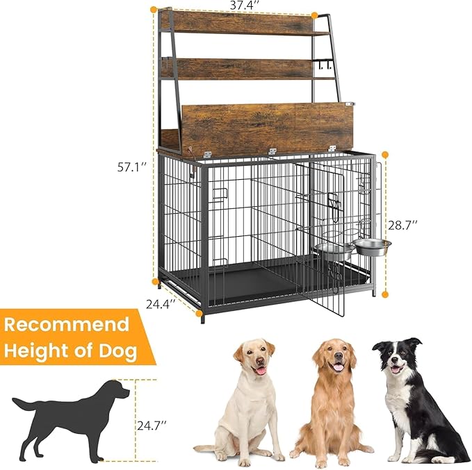 57 Inch Dog Crate Furniture with Storage - Large Dog Cage with Double Door,Dog House Kennel Indoor with Two 7" Dog Bowls,37.4"×24.4"×57.1",Vintage