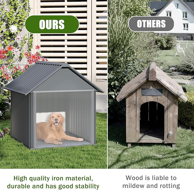 - LIGHTWEIGHT YET STURDY BUILD: Unlike traditional wooden dog houses, this model features a rust-resistant iron frame that’s lighter, stronger, and more durable. Reinforced with screws for extra stability, it resists deformation, corrosion, and daily wear—ideal for long-term outdoor use