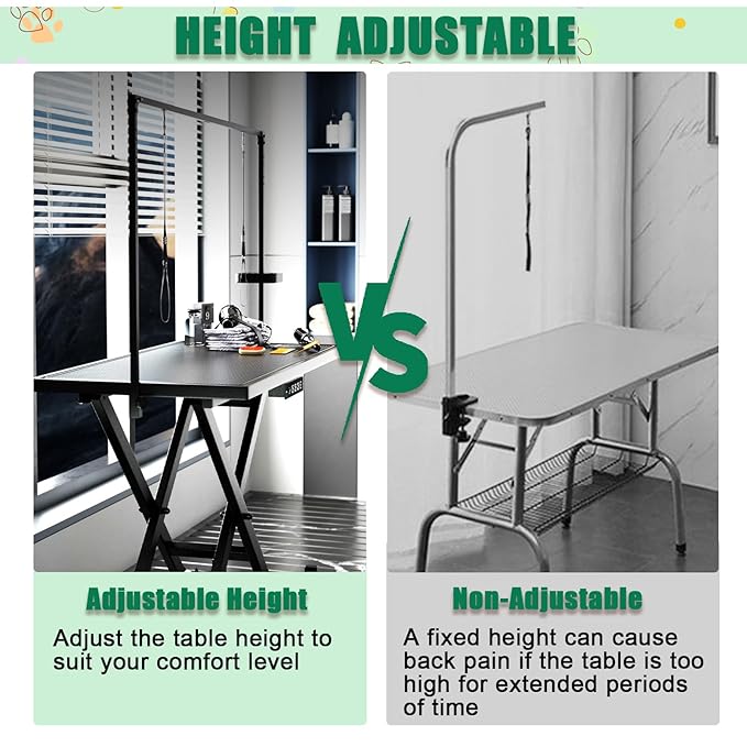 - 【X-Shaped Height-Adjustable Table】Our electric pet grooming table features an X-shaped lift design with a foot pedal for easy adjustment. The adjustable height range is 9.84 to 38.6 inches, making it easy for larger, elderly, and frail pets to get on and off the table, reducing you back pain during extended care. The adjustable overhead arm and lanyard secure your pet, preventing it from falling. This makes combing, trimming, grooming, and blow-drying easy