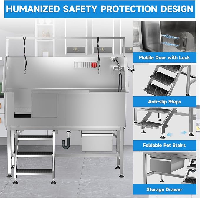 - 【CONVENIENT DESIGN】Our bath tub for dogs with excellent design quality: ① Sliding storage drawer for neatness and storage. ② Double rubber seal prevents water leakage. ③ Adjustable position of faucet and shower head. ④ Removable Floor Grate.