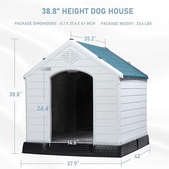 LEMBERI Durable Waterproof Plastic Dog House for Small to Large Sized Dogs, Indoor Outdoor Doghouse Insulated Puppy Shelter with Elevated Floor, Easy to Assemble (Blue with Liner, 42''L*38''W*39''H)
