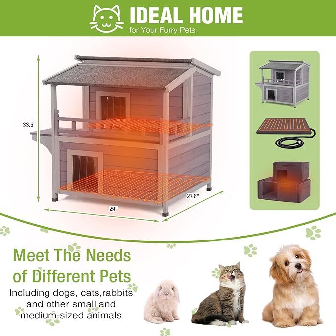 - SAFE HEATING PAD SYSTEM: This 2-story heated cat house comes with an automatic thermostat heater that maintains a consistent 85–115°F—perfect for keeping your cats cozy. It has built-in overheat protection to prevent excessive warmth, plus a chew-resistant cord to stop curious cats from damaging the line. You get worry-free warmth knowing your pet is safe, even when unsupervised
